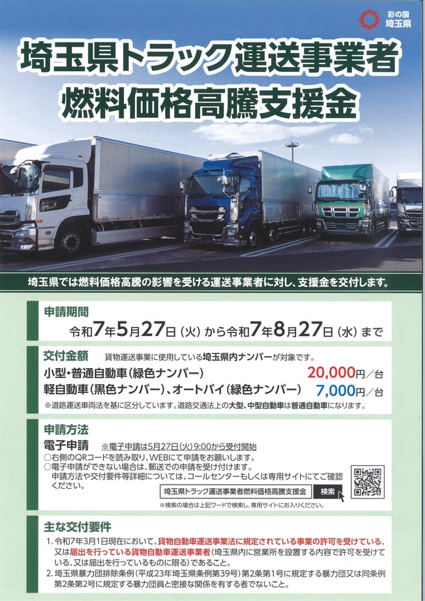 埼玉県では燃料価格高騰の影響を受ける運送事業者に対し、支援金を交付します。