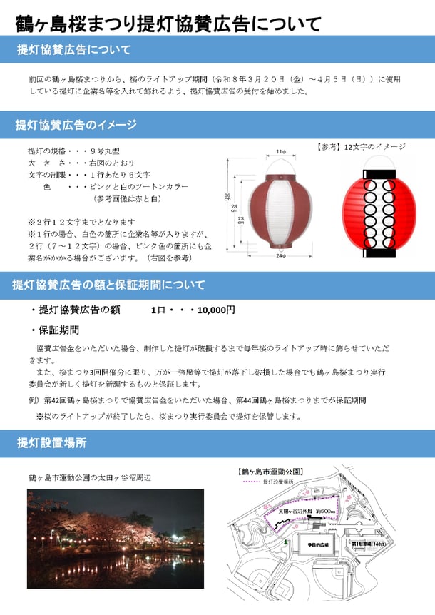 前回の桜まつりから、桜のライトアップ期間(令和8年3月20日(金)~4月5日(日)に使用している提灯に企業名等を入れて飾れるよう、提灯協賛広告の募集を始めました。